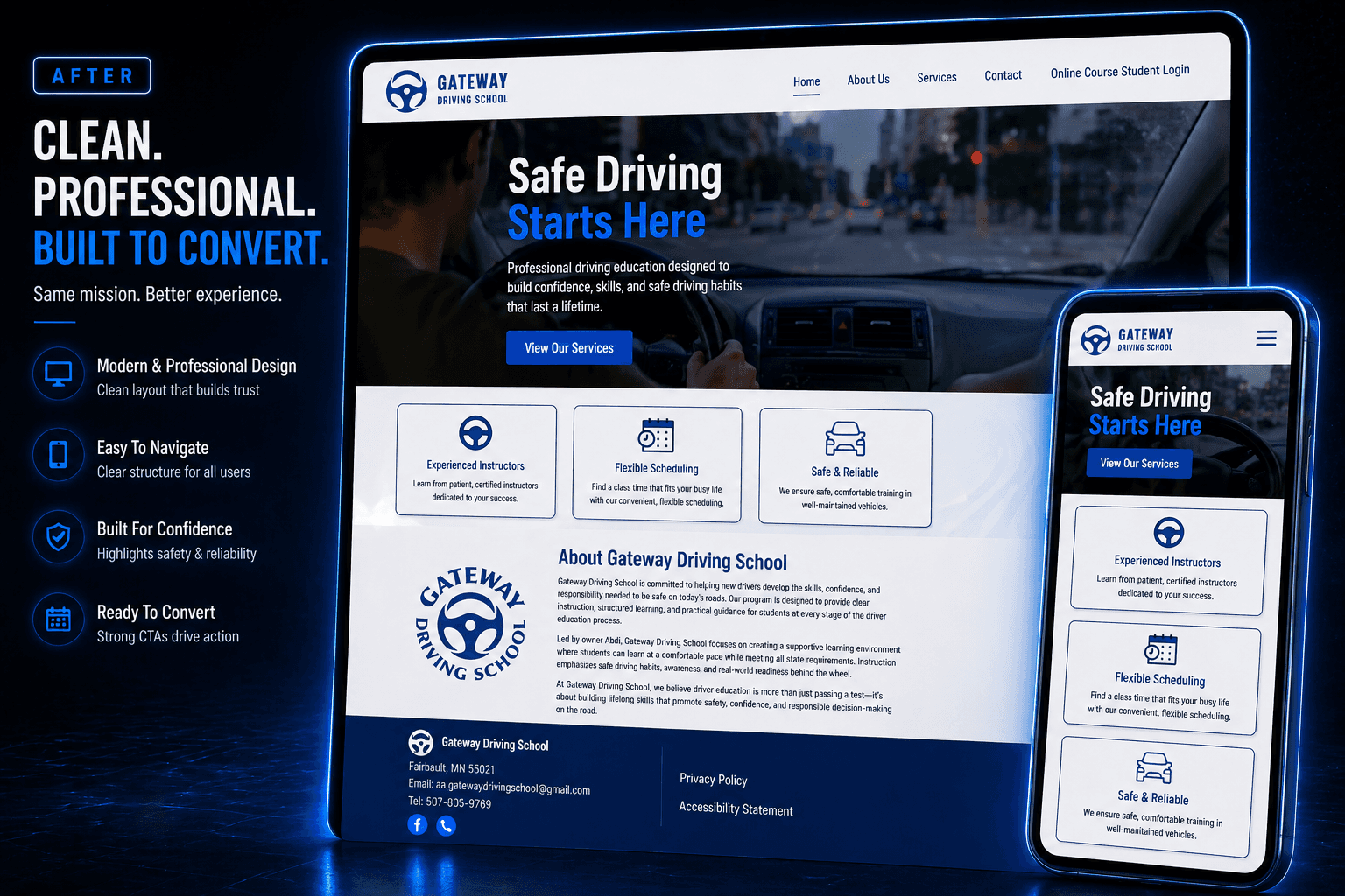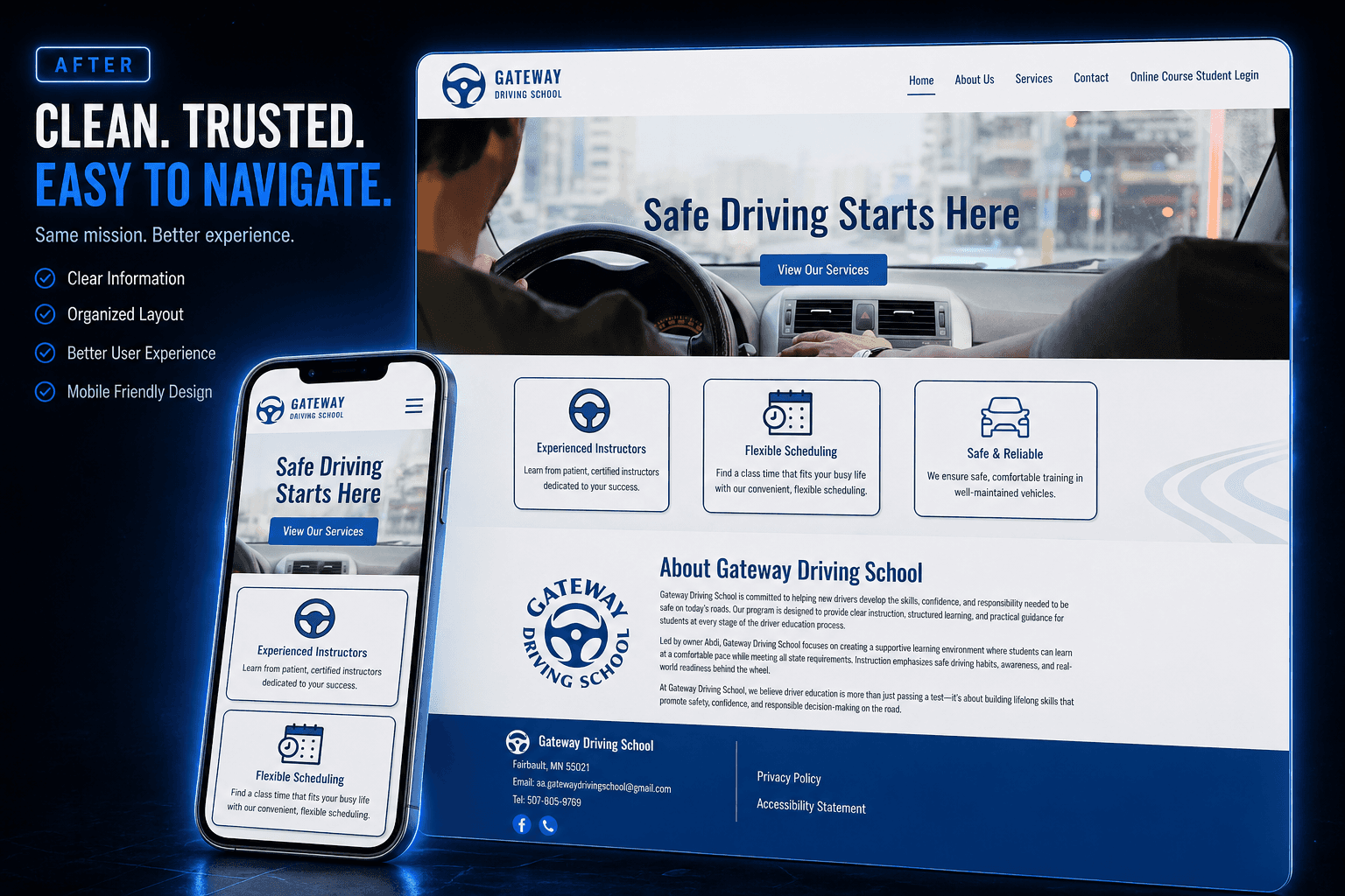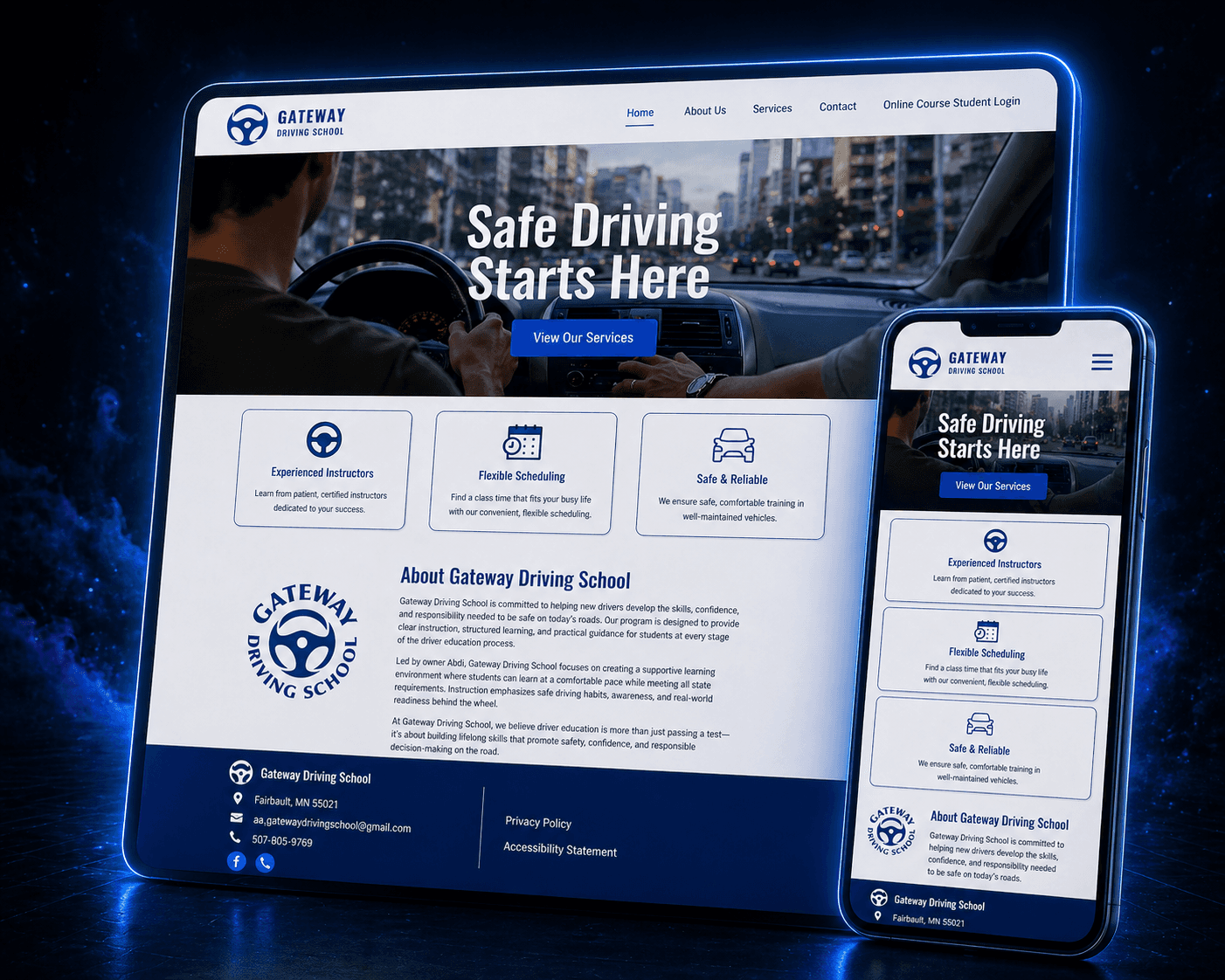 The Gateway Driving School website was built from the ground up with a focus on simplicity, clarity, and speed. The layout is intentionally clean and structured, allowing users to quickly understand what the school offers and how to get started.