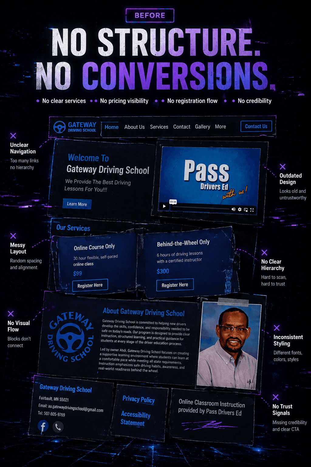 As a new driving school, Gateway had no existing website or structured online presence. Without a central platform, there was no clear way to present services, build trust with potential students, or guide users toward registration.